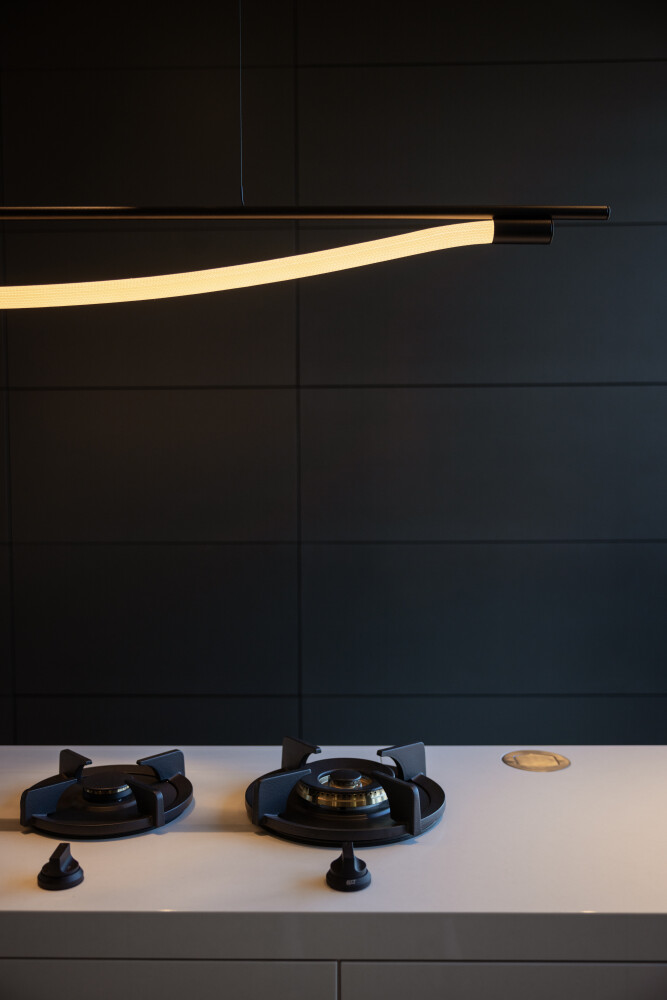 Levity is a series of minimal and poetic flexible lights, combining a rigid metal frame with a draped textile shade. Feelings of both lightness and gravity are prompted by the Levity loop’s elegant, gentle forms. A variation on the Levity Halo pendant, the Levity Linear styles are a commitment to effortlessness; the powder coated metal frame holds up the soft, draped light in a simple, elegant statement. A LED source is enclosed within a flexible silicone tube and wrapped in a nylon textile sleeve, providing even diffusion that conceals the integrated LED light source. Offered in two lengths – the fixtures can be layered together or used as a singular lighting statement.