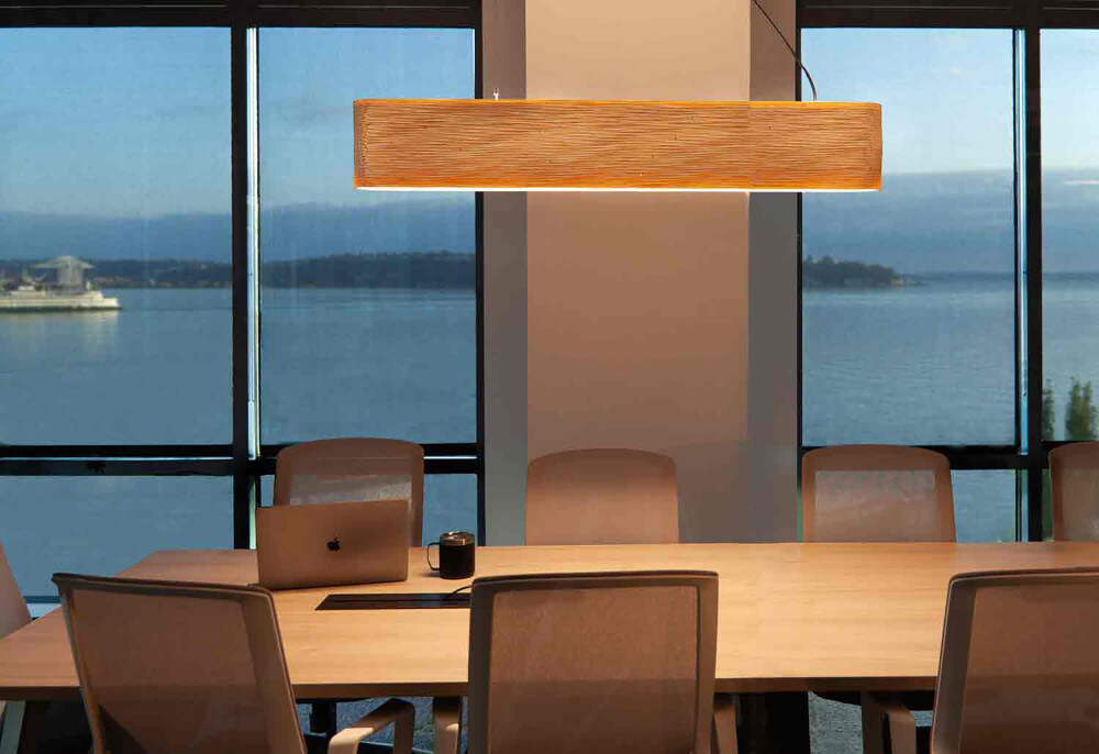 Hewn is a linear shape that is as beautiful as it is hardworking, adding a tactile and creative addition to a mundane field of task lighting. Hewn is created using a cutting process where layers of the shade are cut parallel to the flutes of the cardboard versus the perpendicular cut lines of our other Scraplights shapes – this cutting process was intentional allowing us to build something beautiful and textural while also being fully opaque. As a task light, Hewn delivers a broad footprint of illumination and the shape is very suitable over a desk, dining table or kitchen island.