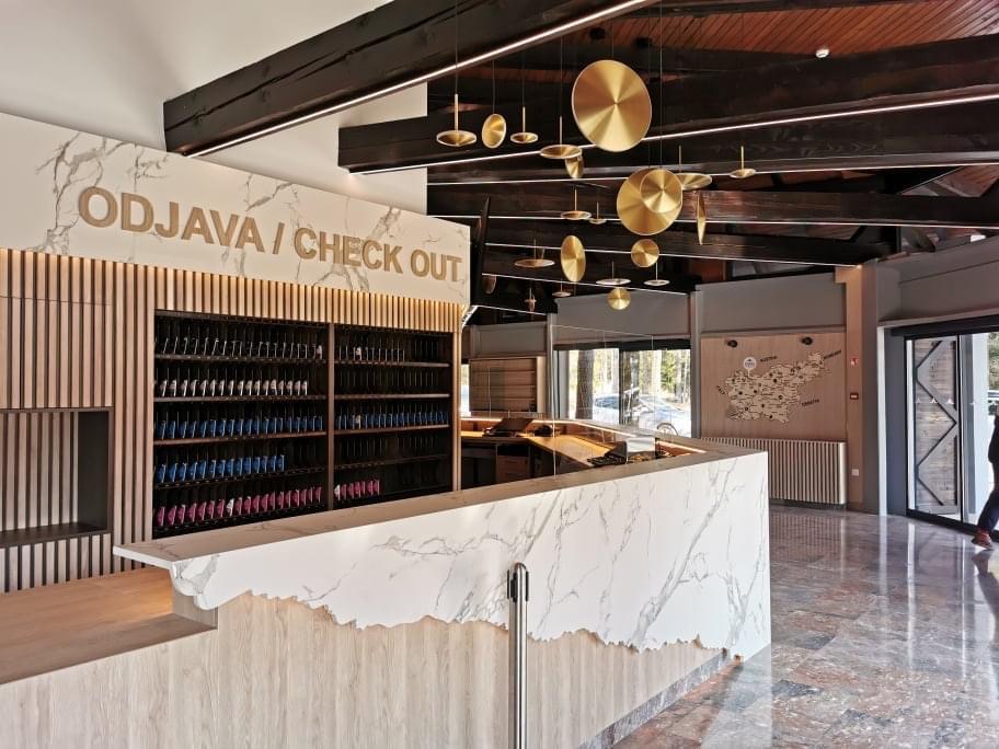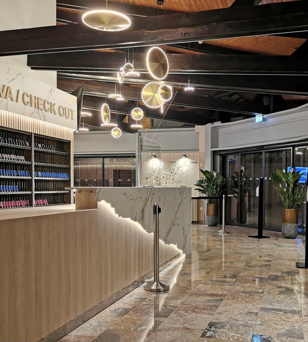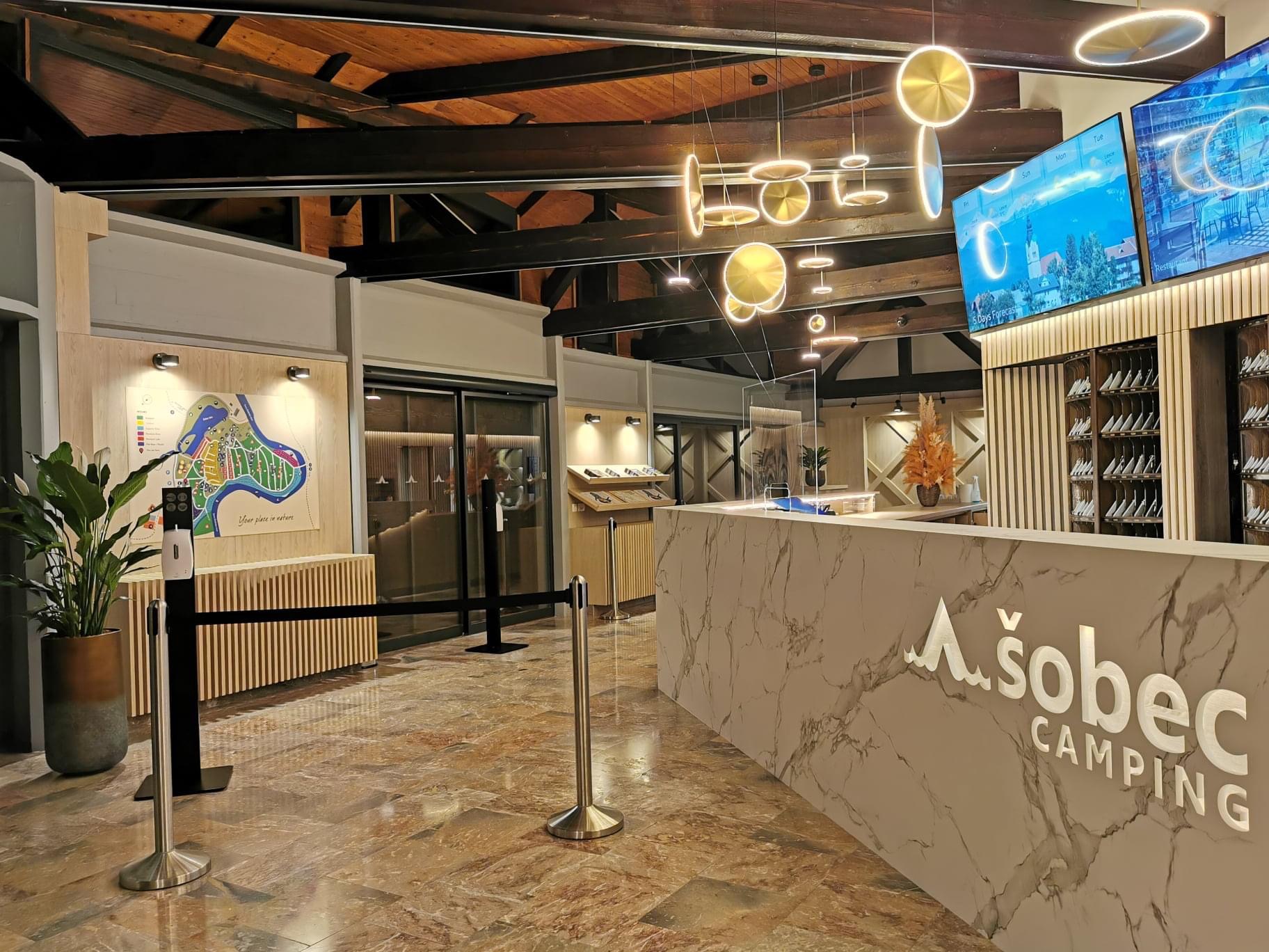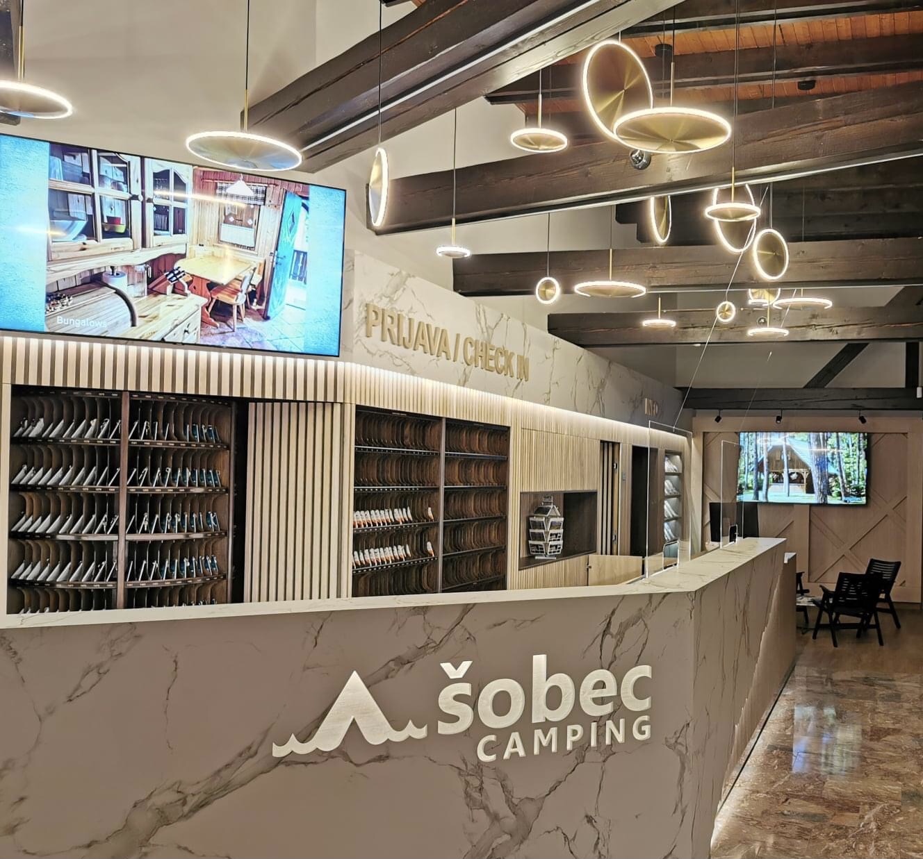A warm welcome starts with good light. For the renovated reception of Šobec Camping in Slovenia, we designed the interior lighting using our Graypants Chrona collection. The combination of warm brass tones, a marble counter, and the wooden ceiling creates a stylish and inviting atmosphere, exactly what you’d hope to find when arriving in this beautiful natural setting.