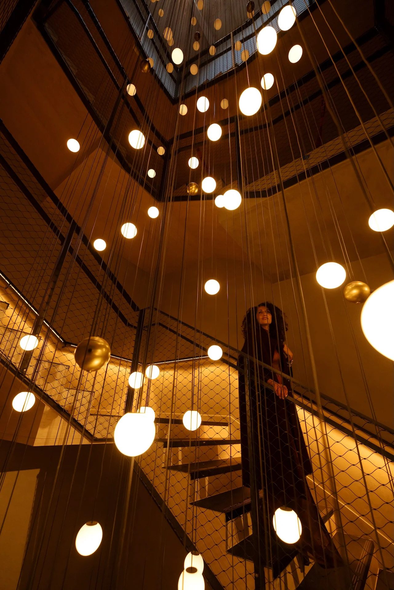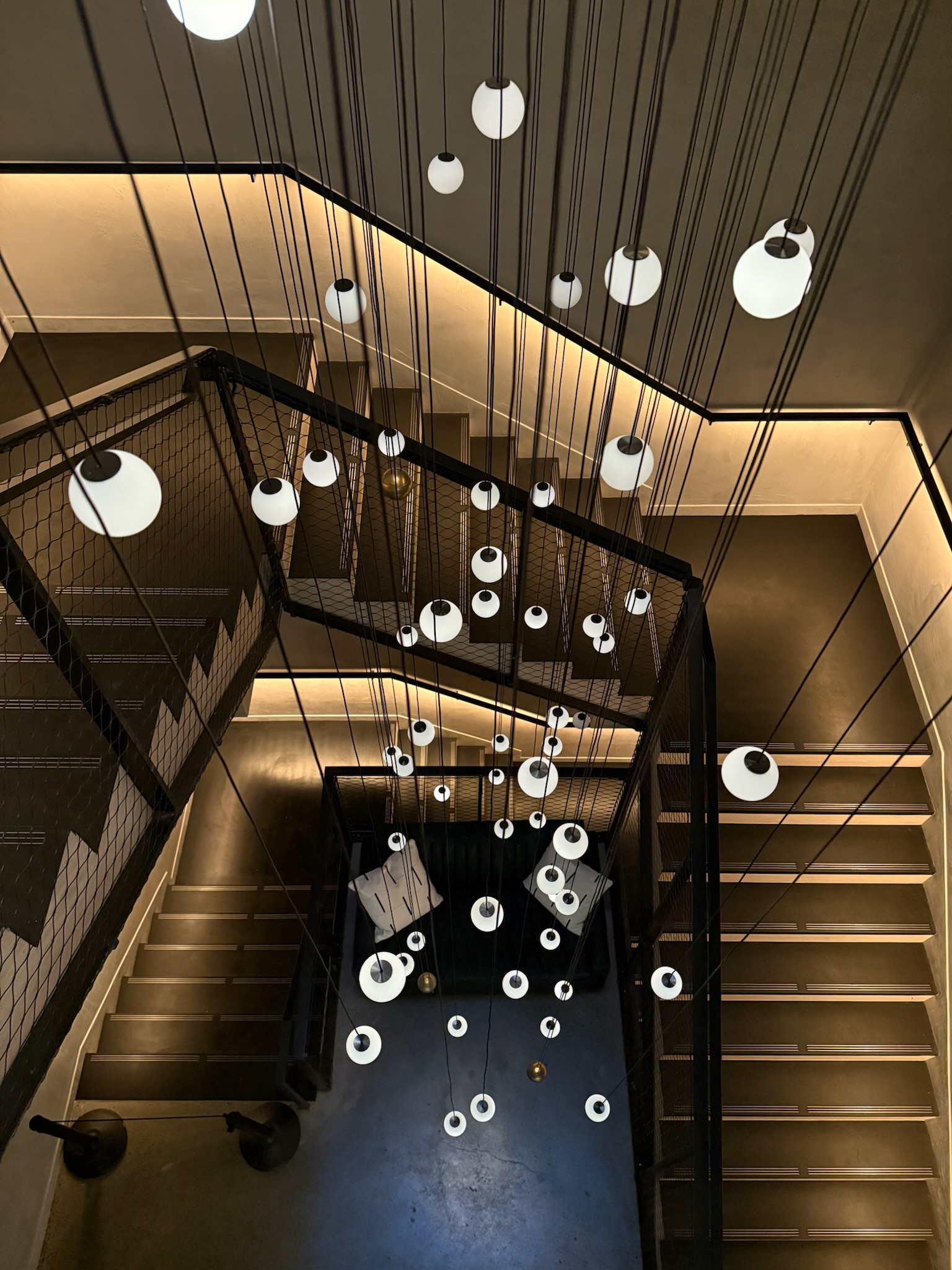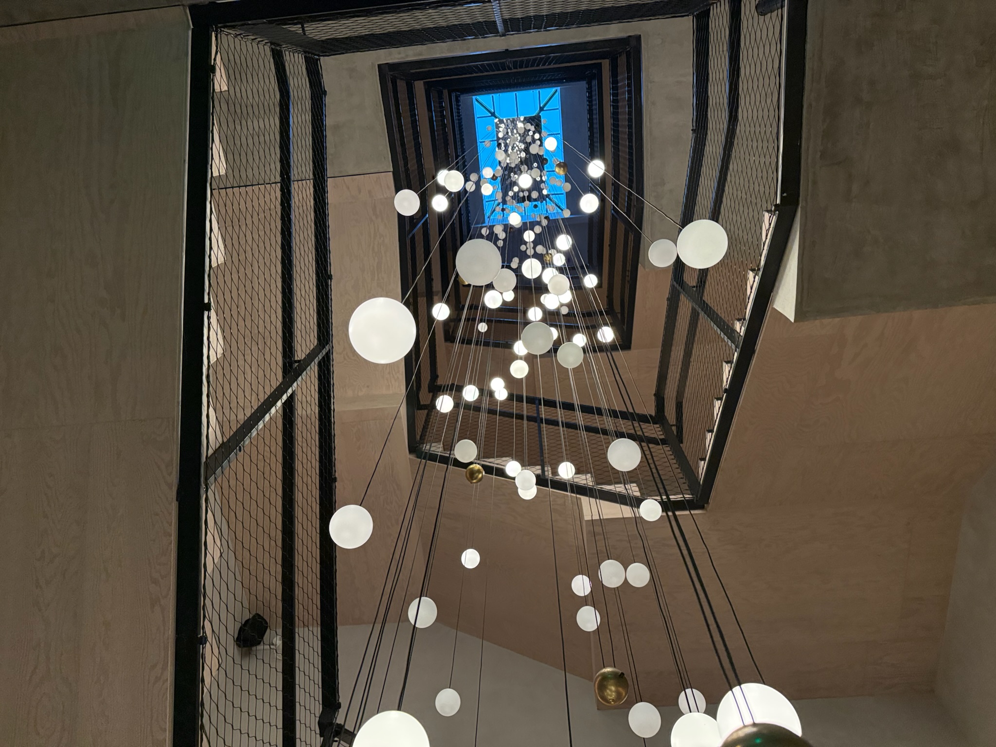 In the stairwell, we installed a custom Loci Globe setup in glass. By combining globes in different hanging heights, we turned what is normally just a functional space into a strong visual feature that runs through the full height of the building.