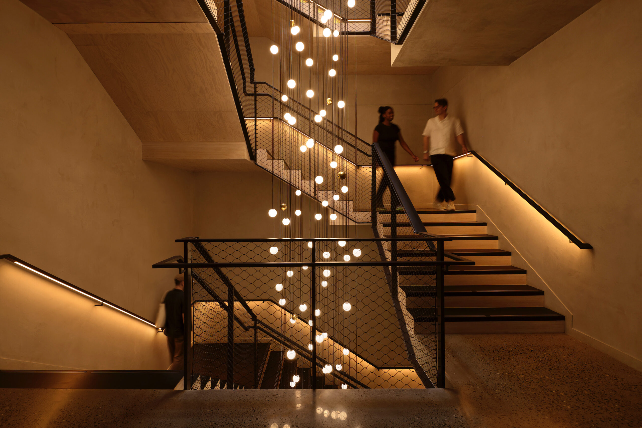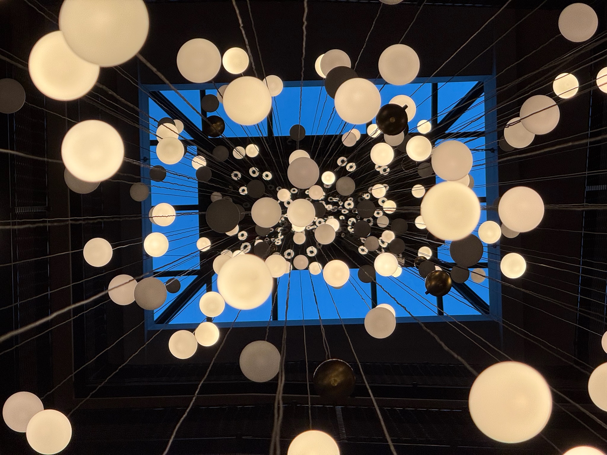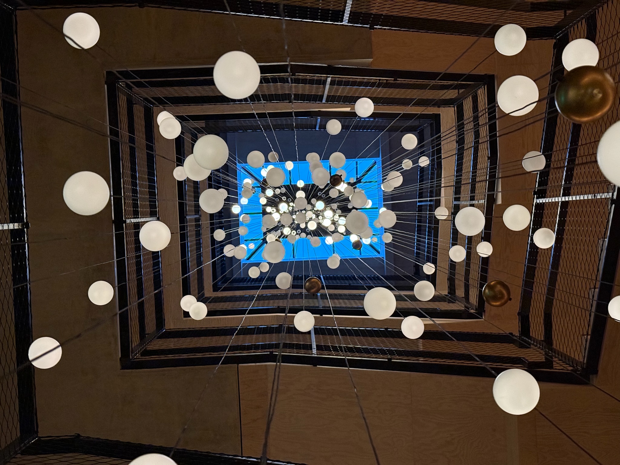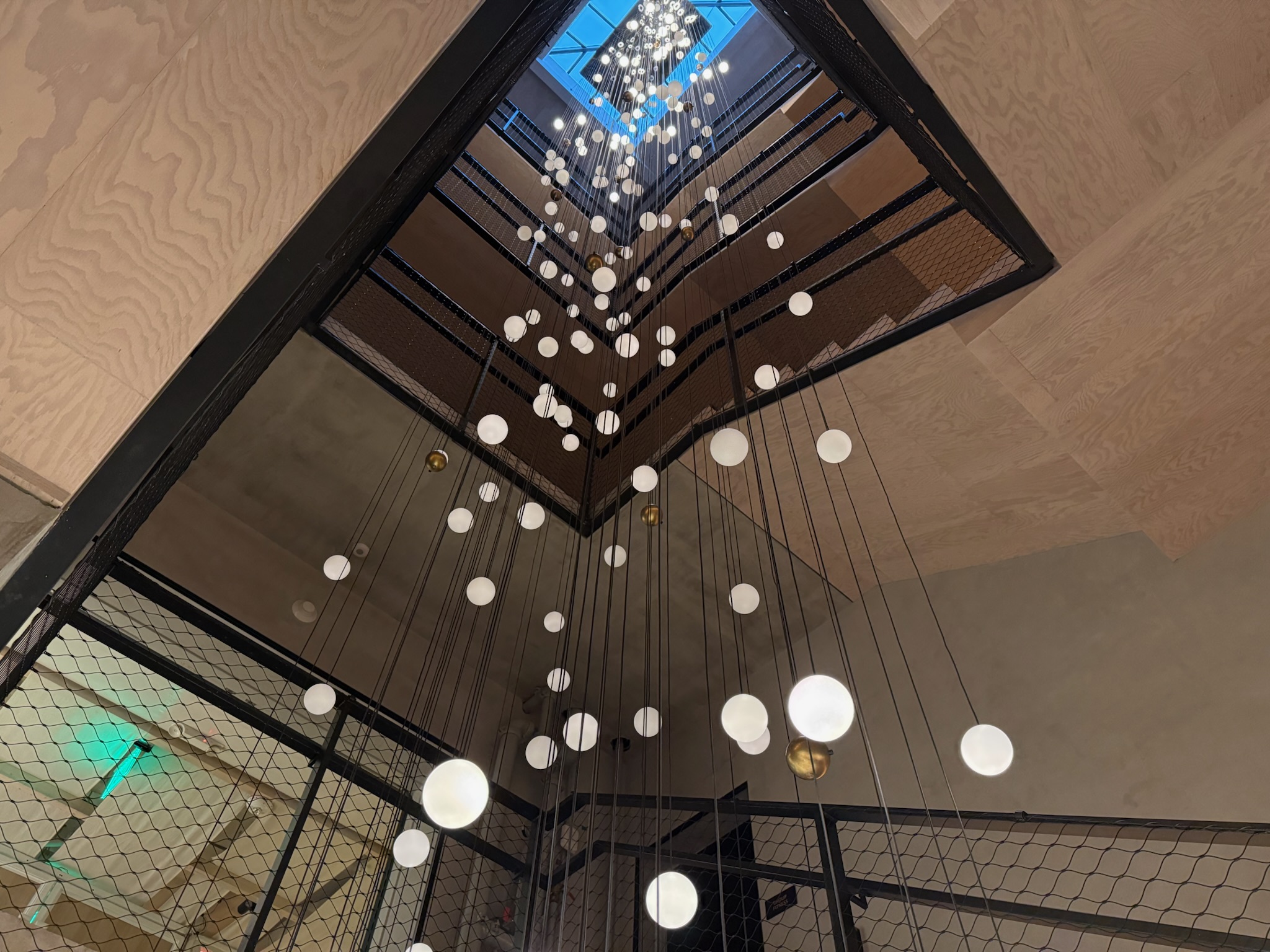In the stairwell, we installed a custom Loci Globe setup in glass. By combining globes in different hanging heights, we turned what is normally just a functional space into a strong visual feature that runs through the full height of the building.
