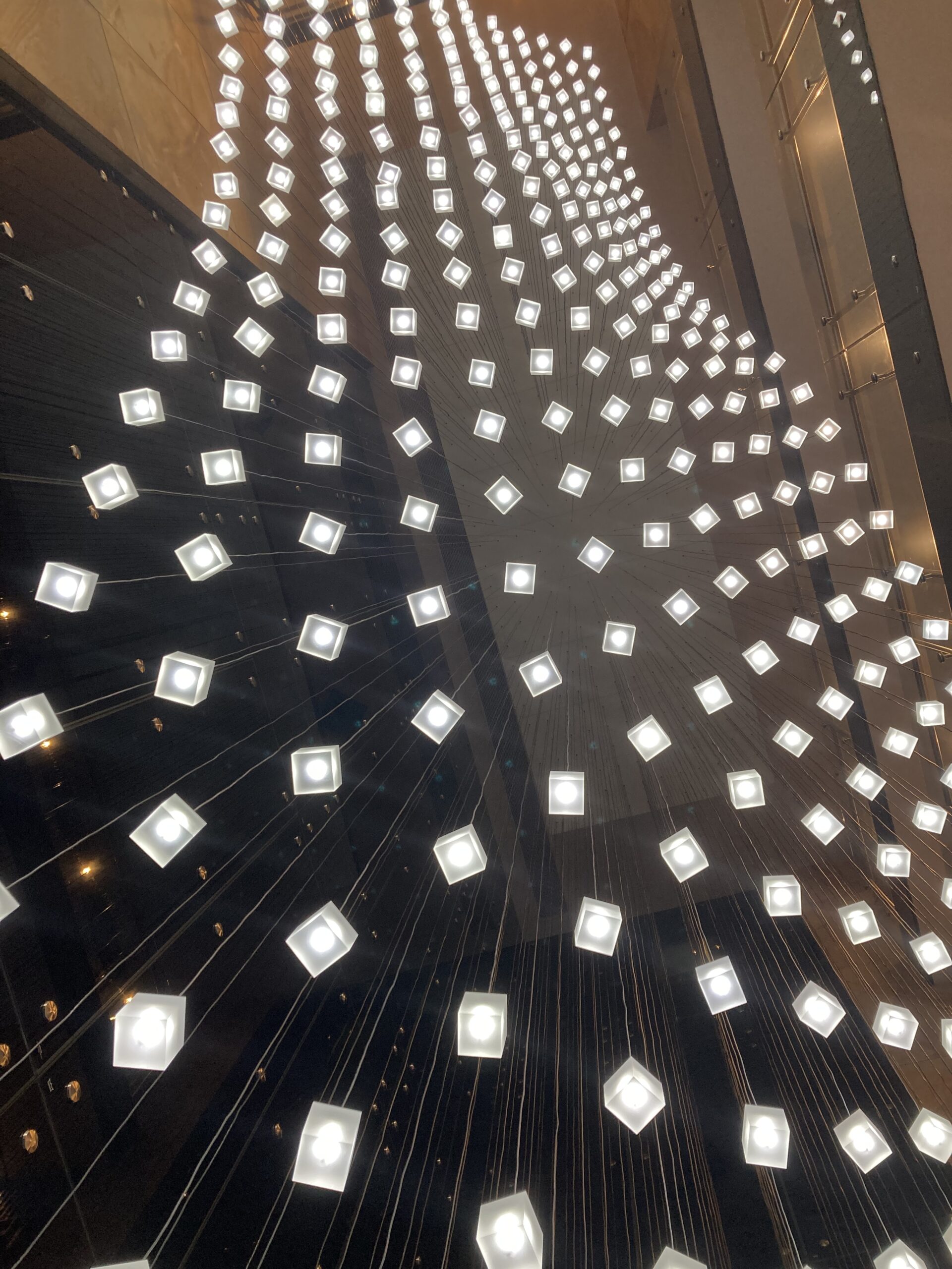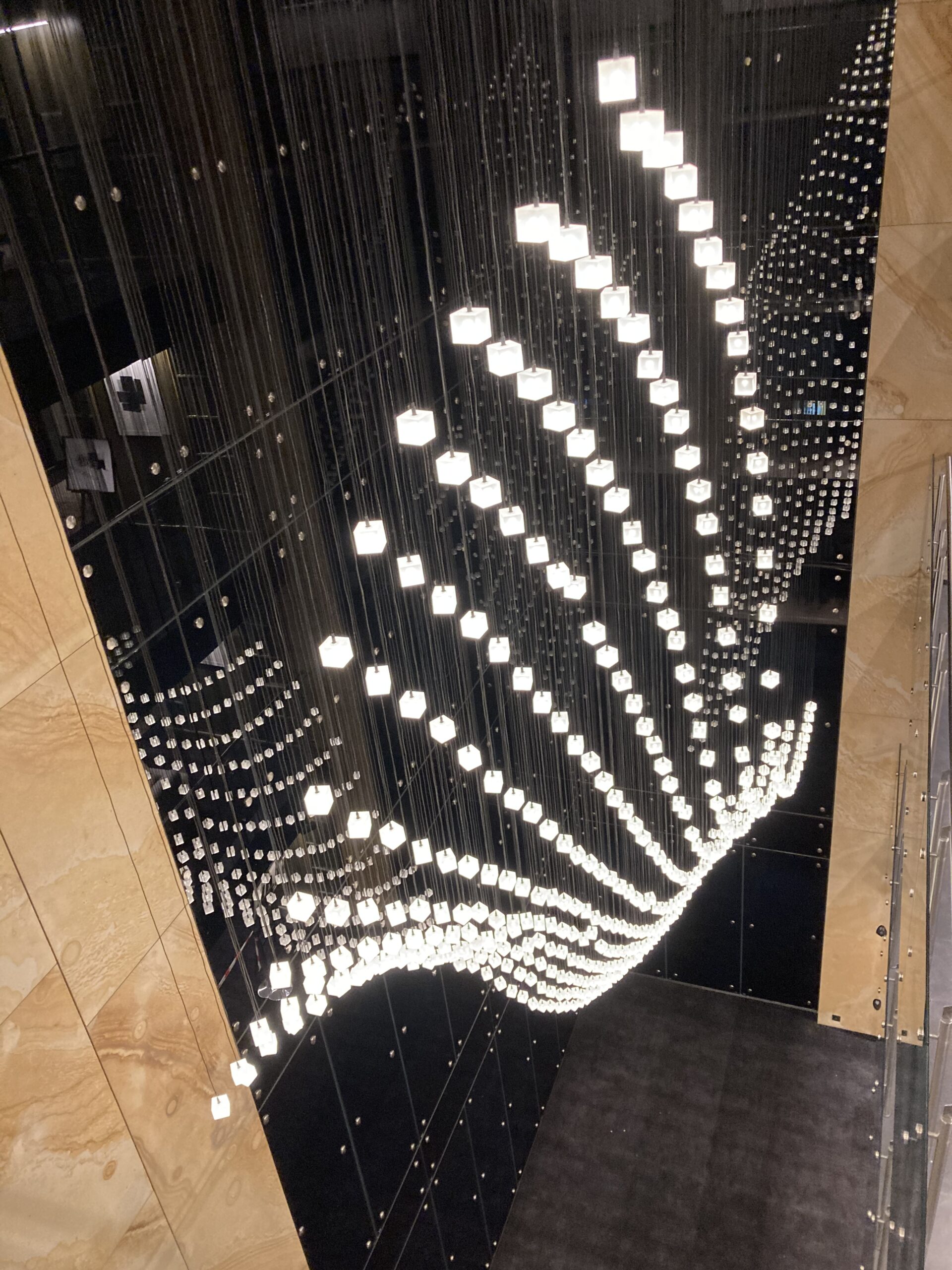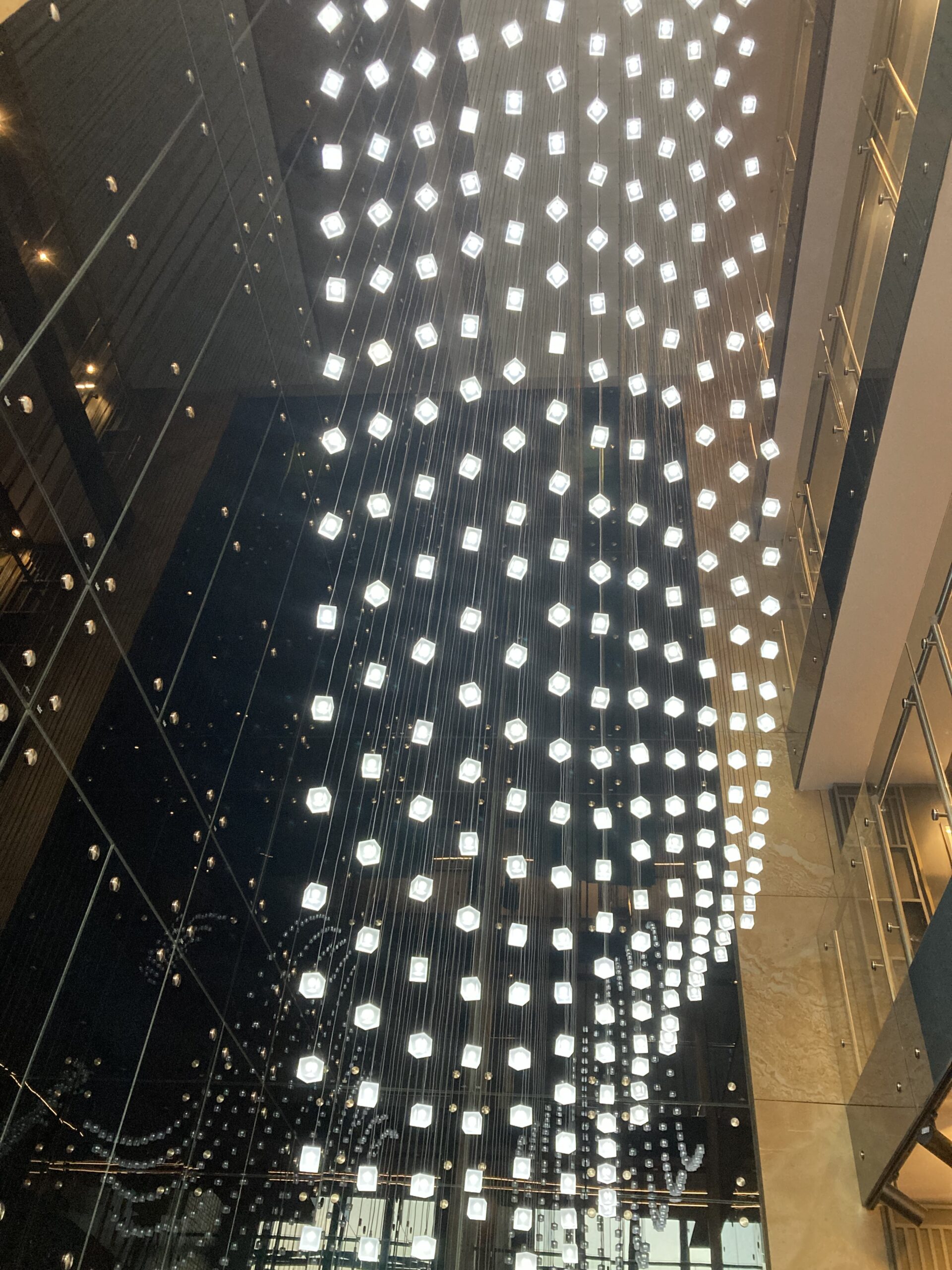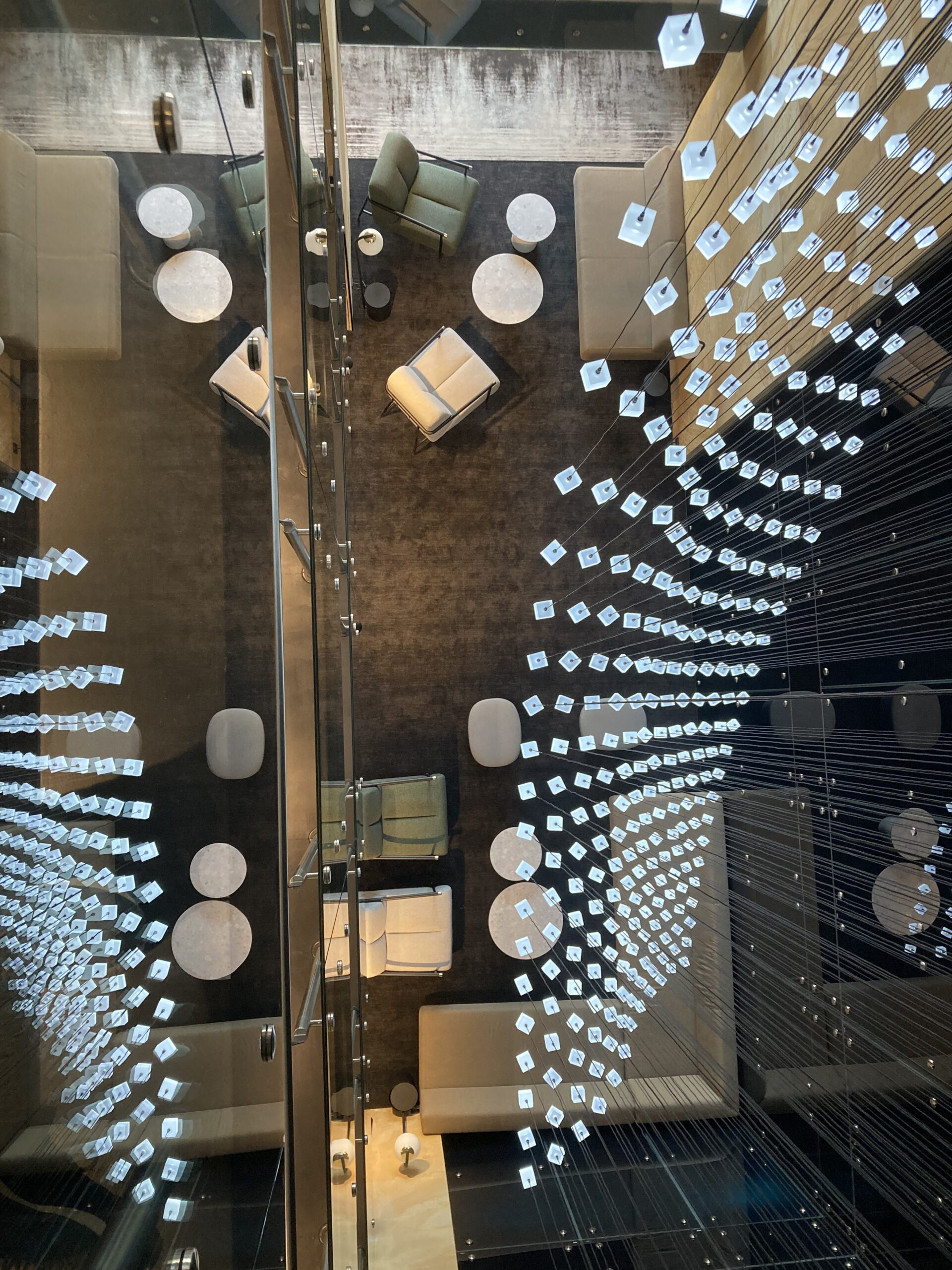 The installation captures the essence of Loci: modular design, natural rhythm, and architectural harmony. Seen from below, it feels as if a wave of light cascades above you — turning the lobby into a living, breathing sculpture.