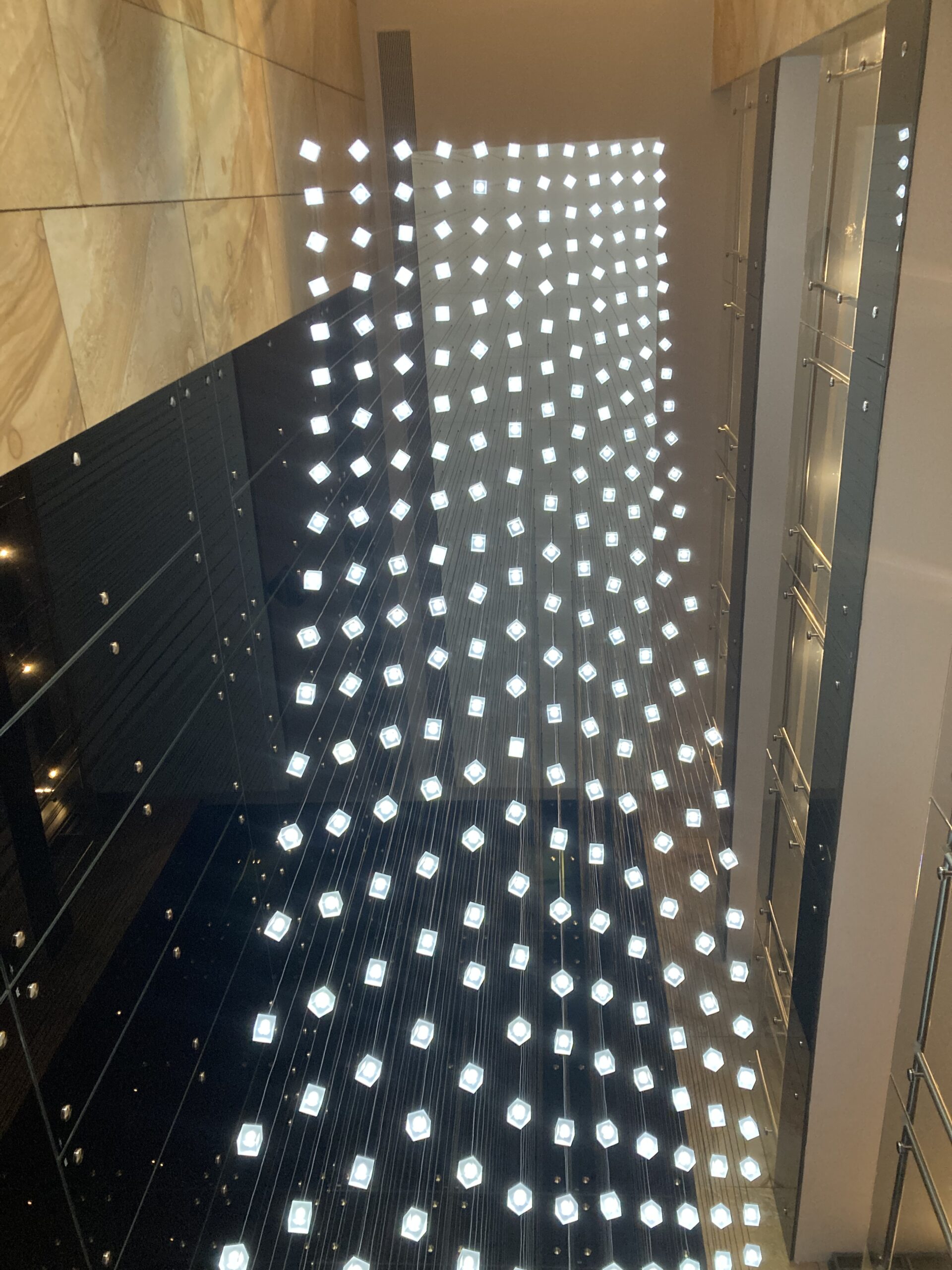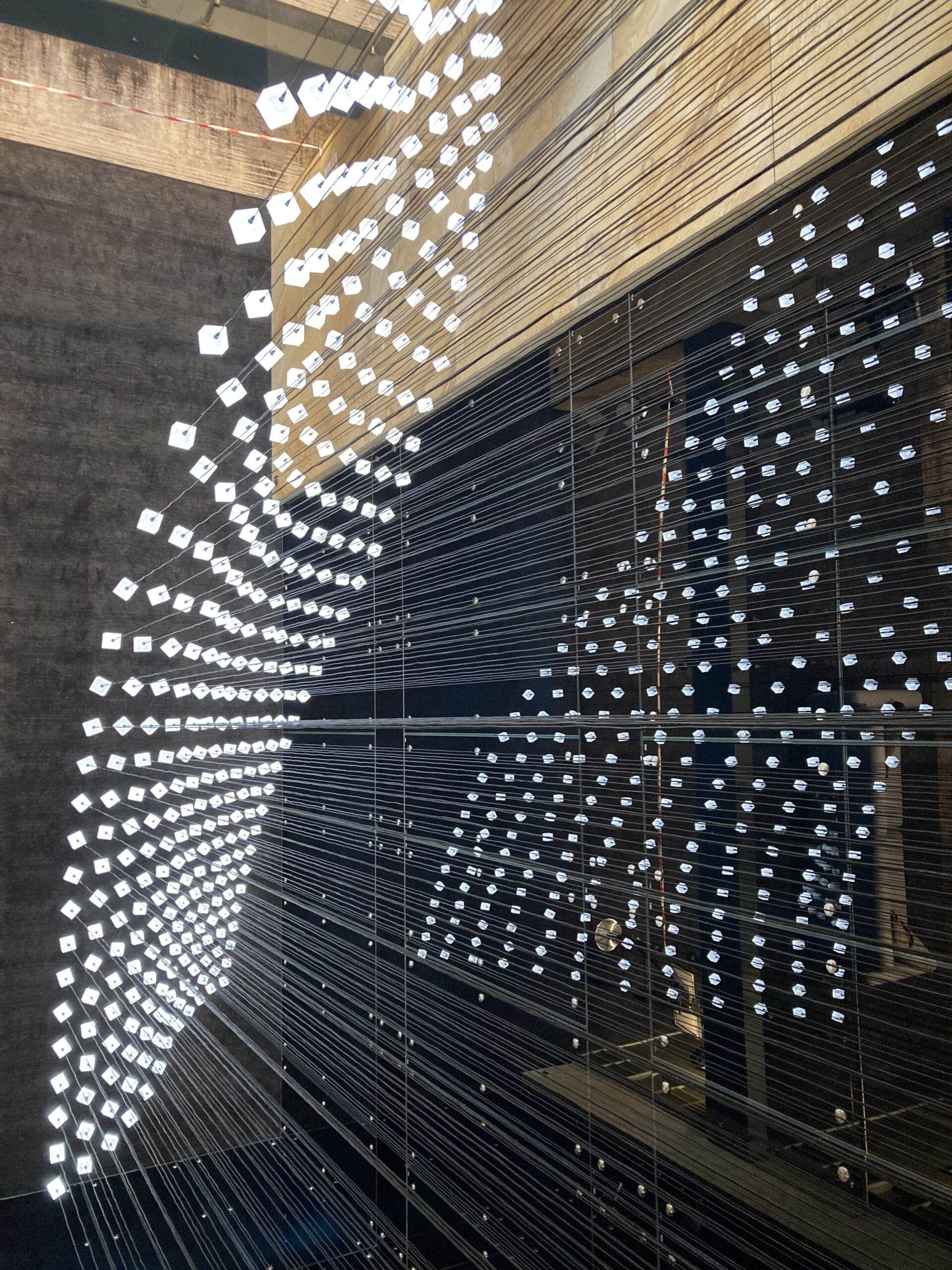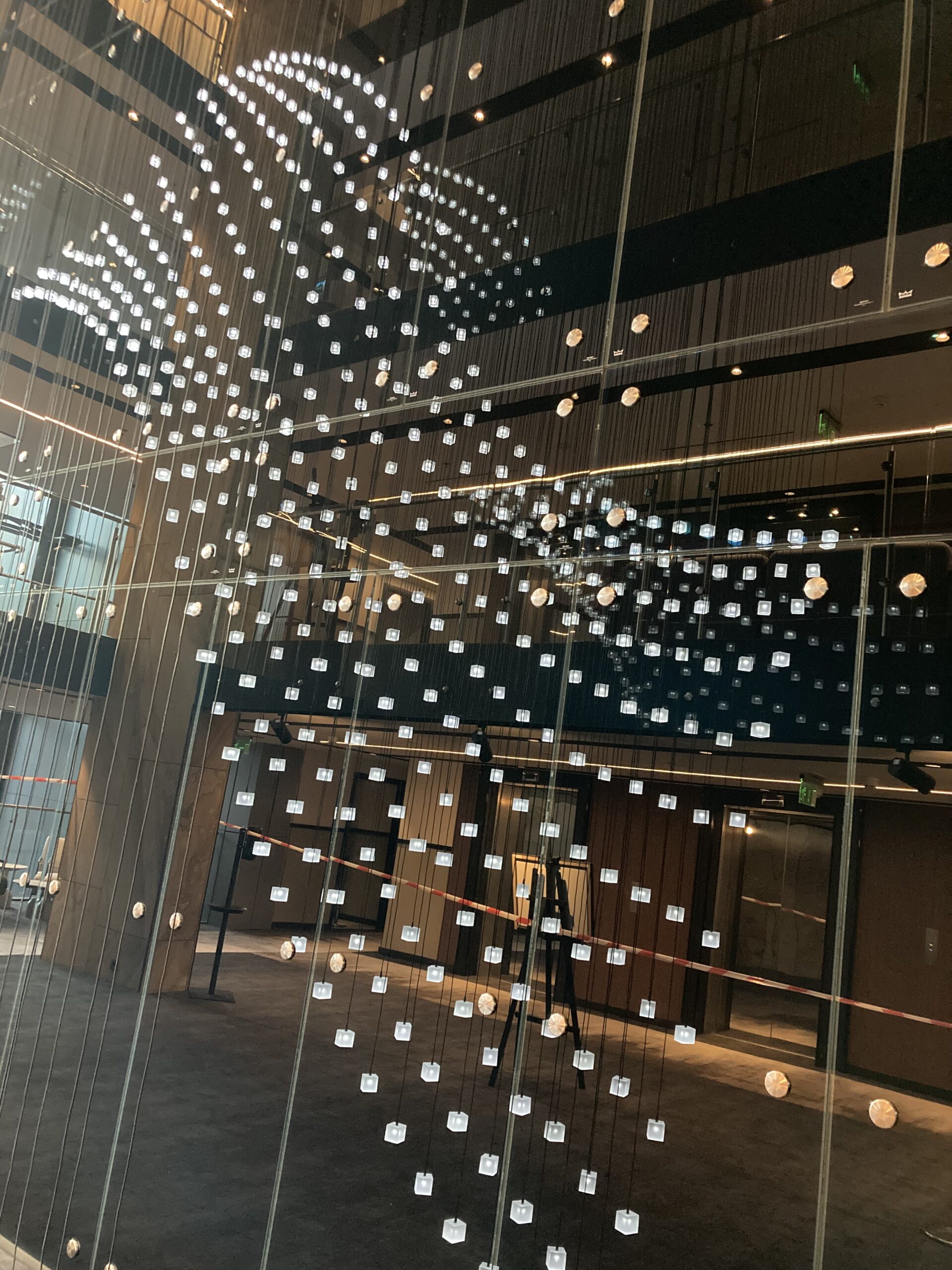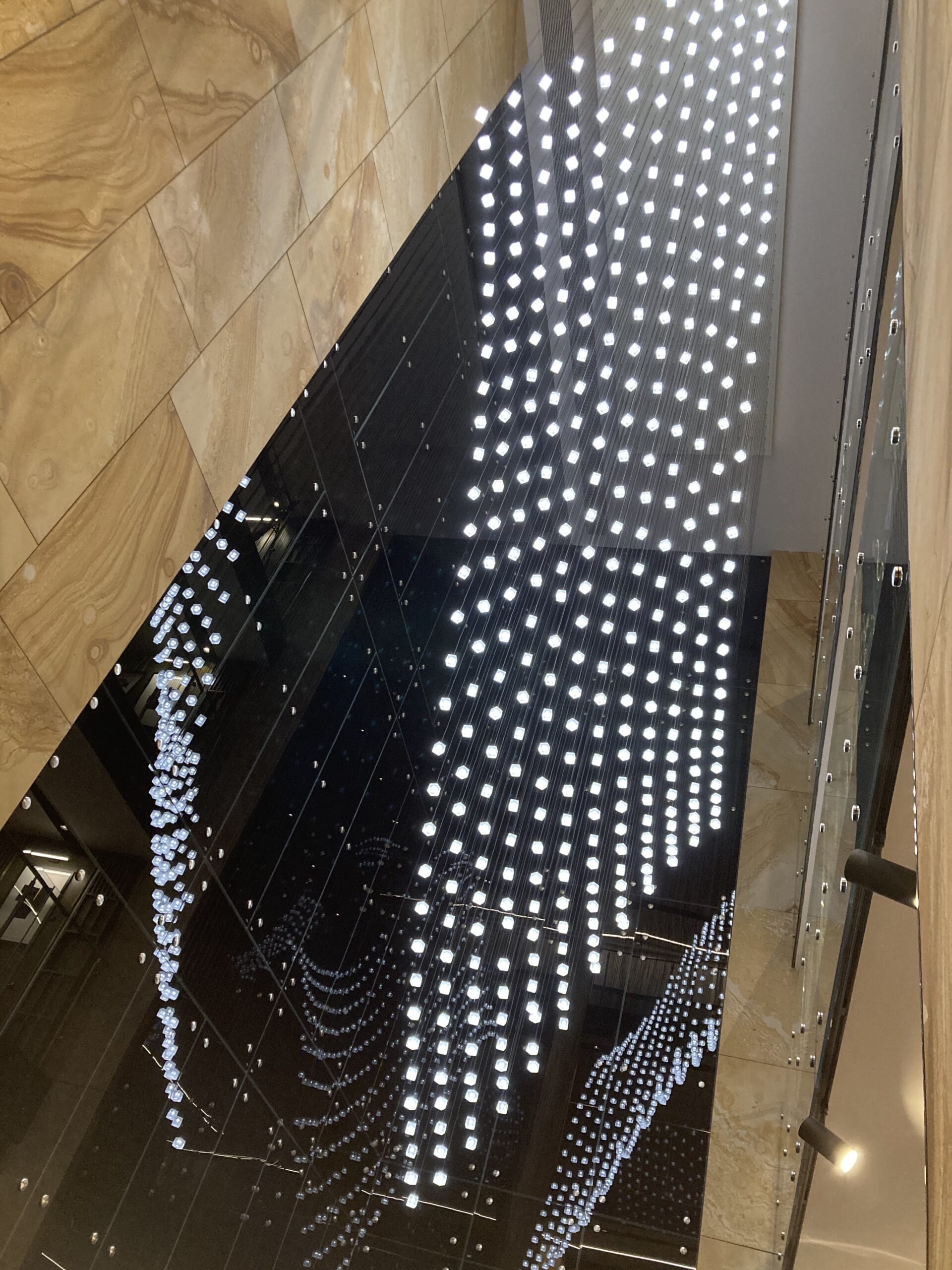 The installation captures the essence of Loci: modular design, natural rhythm, and architectural harmony. Seen from below, it feels as if a wave of light cascades above you — turning the lobby into a living, breathing sculpture.
