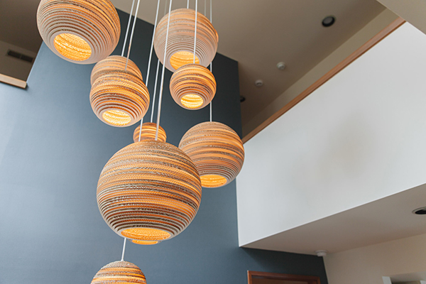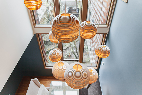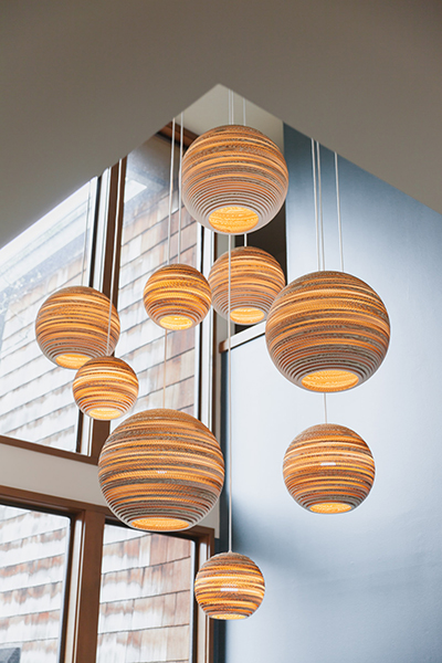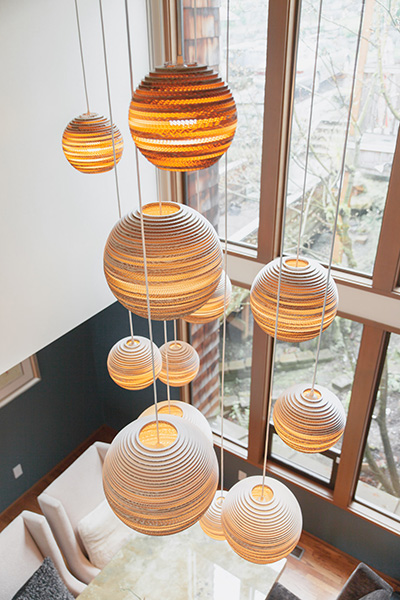 This custom installation for a family residence in the greater Seattle area uses the blonde variation of the Scraplights Moon series. The variation features white cardboard with a burned edge to create a warm white finish.